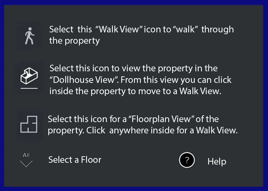 Move naturally through the interior, then zoom out to the Dollhouse or Floorplan view for a unique perspective of the layout of the space